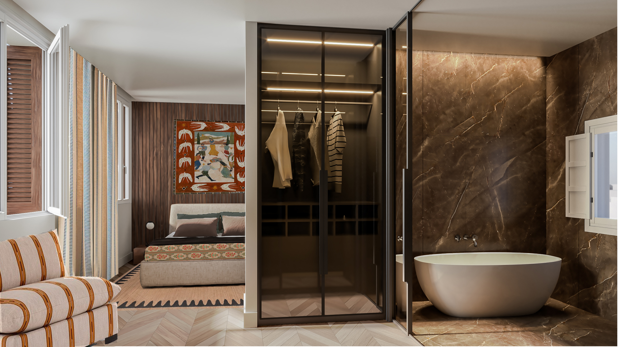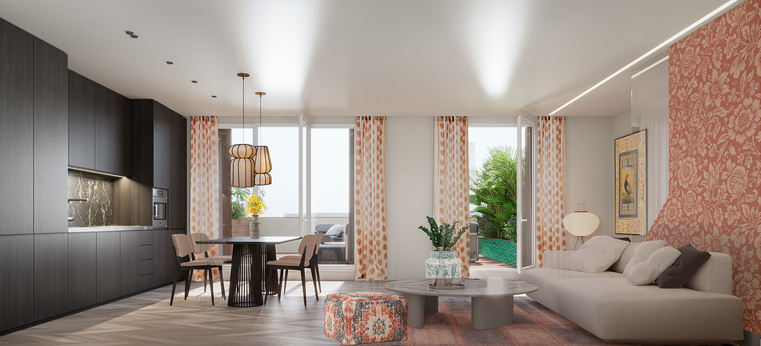 Este proyecto es una segunda vivienda para una pareja: un dúplex donde los materiales naturales inspiran calma. Colores y estampados de Europa y Oriente Medio se entrelazan, evocando sus raíces, su familia y una identidad cultural compartida. Cada rincón refleja no solo su estética, sino también un estilo de vida funcional y profundamente personal.