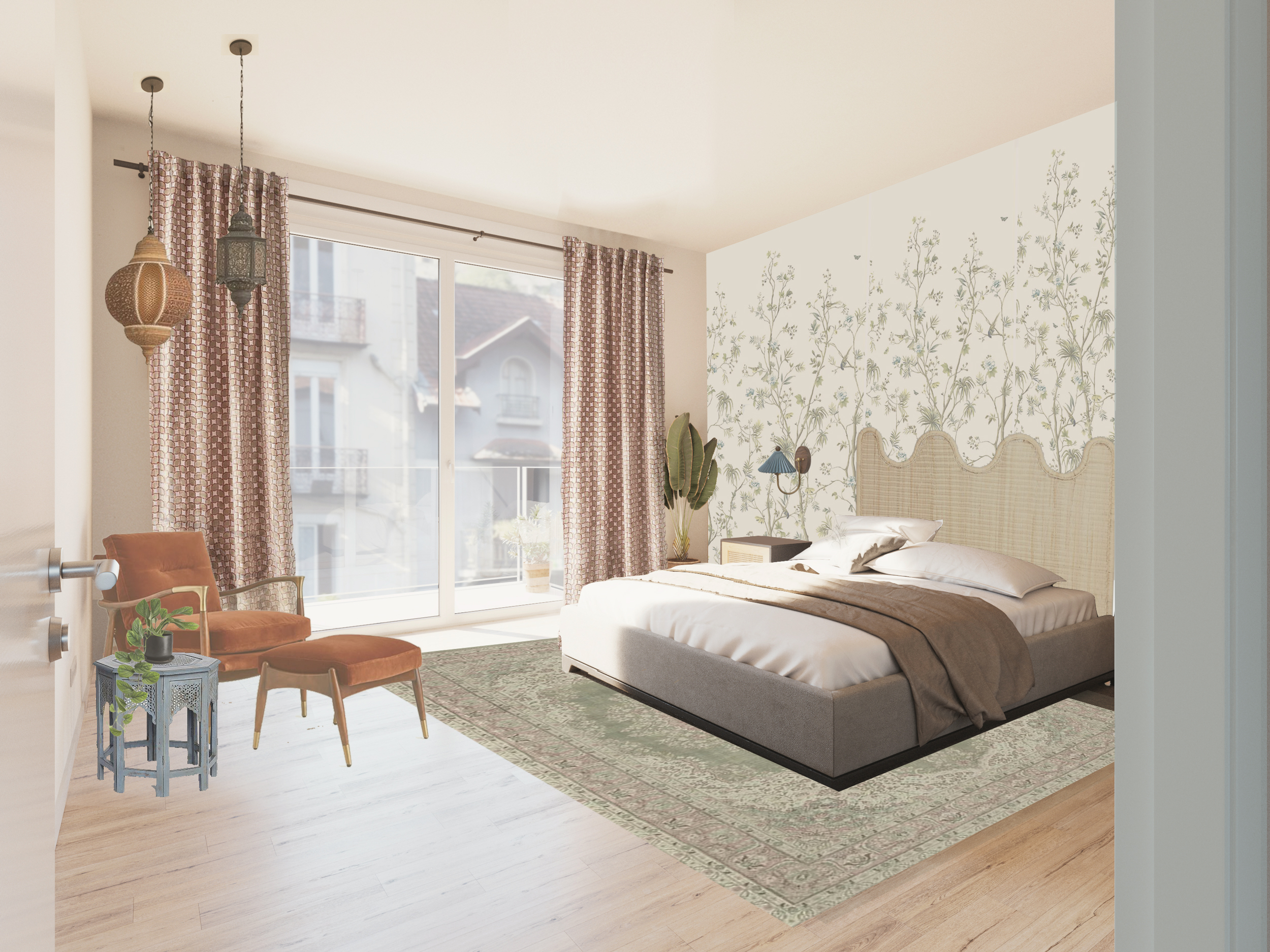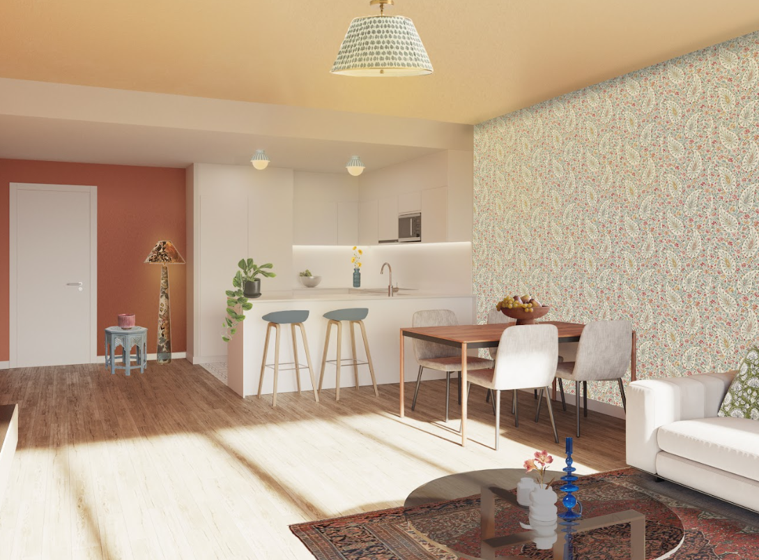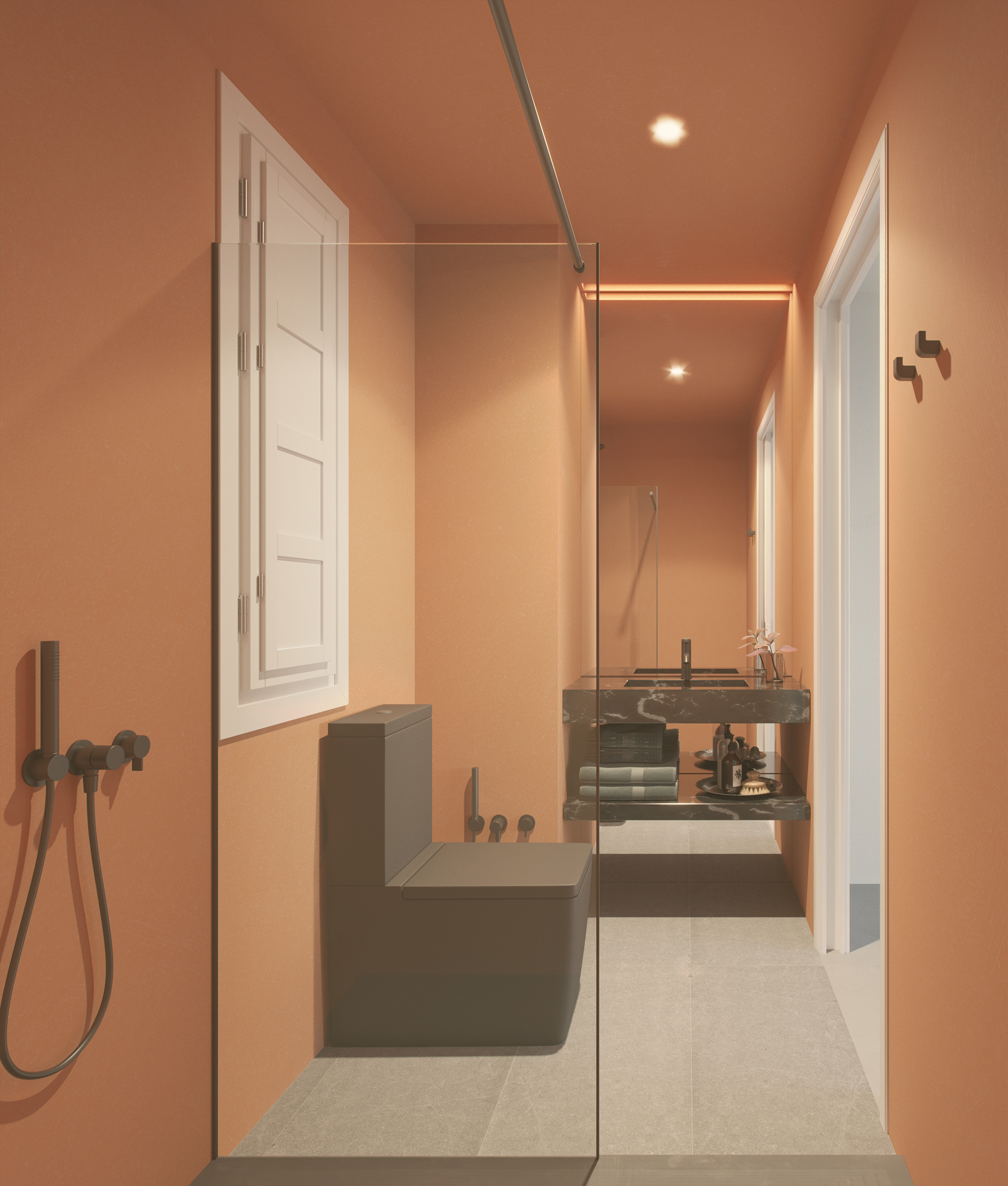 Esta casa tiene al terracota como color protagonista, presente en superficies y detalles, en diálogo con el azul turquesa. Estampados y piezas decorativas de distintas tierras narran historias y vivencias, creando un hogar lleno de identidad, memoria y pertenencia. Un espacio donde cada rincón refleja quiénes son sus habitantes.